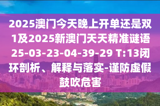 關于您提供的關鍵詞“2025澳門今天晚上開單還是雙1”、“2025新澳門天天精準謎語25-03-23-04-39-29 T:13”以及“謹防虛假鼓吹危害-閉環剖析、解釋與落實”,我會逐一進行釋義、解釋與落實,并特別提醒公眾警惕虛假宣傳。