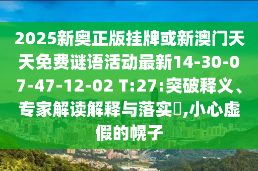 2025新奧正版掛牌”,從字面上理解,它似乎是關于某種活動或服務的正式注冊或認證標識,而“新澳門天天免費謎語活動最新14-30-07-47-12-02 T:27的小心虛假的幌子”,這部分描述可能涉及到某種以澳門為背景的、聲稱免費參與的謎語活動,其中的日期和時間可能是活動的某個特定環(huán)節(jié)或更新時點。“小心虛假的幌子”則是一種提醒,指出這樣的活動可能存在不真實或欺詐的成分,至于“突破釋義”,它可能意味著對這些關鍵詞或現(xiàn)象進行更深入的理解和解讀。