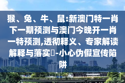 摘要:針對猴、兔、牛、鼠生肖的新澳門特一肖預測和澳門今晚開一肖一特預測,需警惕偽假宣傳陷阱。真正的預測應該基于專業的解讀和解釋,對預測結果進行透徹釋義,避免誤導公眾。請理性對待預測結果,不要盲目相信,以免上當受騙。